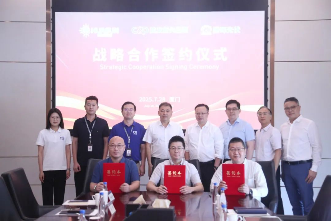 2025年7月28日,廈門建發(fā)新興能源有限公司(以下簡稱“建發(fā)新興能源”)、蘇州騰暉光伏技術(shù)有限公司(以下簡稱“騰暉光伏”)與安徽華晟新能源科技股份有限公司(以下簡稱“華晟新能源”)在廈門建發(fā)集團總部簽署三方戰(zhàn)略合作協(xié)議。此次合作的核心在于引入華晟新能源先進的異質(zhì)結(jié)(HJT)技術(shù)這一“新質(zhì)生產(chǎn)力”,旨在顯著提升騰暉光伏的技術(shù)實力與產(chǎn)品競爭力,實現(xiàn)關(guān)鍵突破。廈門建發(fā)股份有限公司(以下簡稱“建發(fā)股份”)副總經(jīng)理、中利集團股份有限公司(以下簡稱“中利集團”)董事長許加納、建發(fā)新興能源總經(jīng)理、騰暉光伏董事長黃昶、華晟新能源副總裁梁海彬分別代表三方簽署協(xié)議。建發(fā)股份董事長林茂、華晟新能源董事長徐曉華等領(lǐng)導(dǎo)共同見證簽約。
