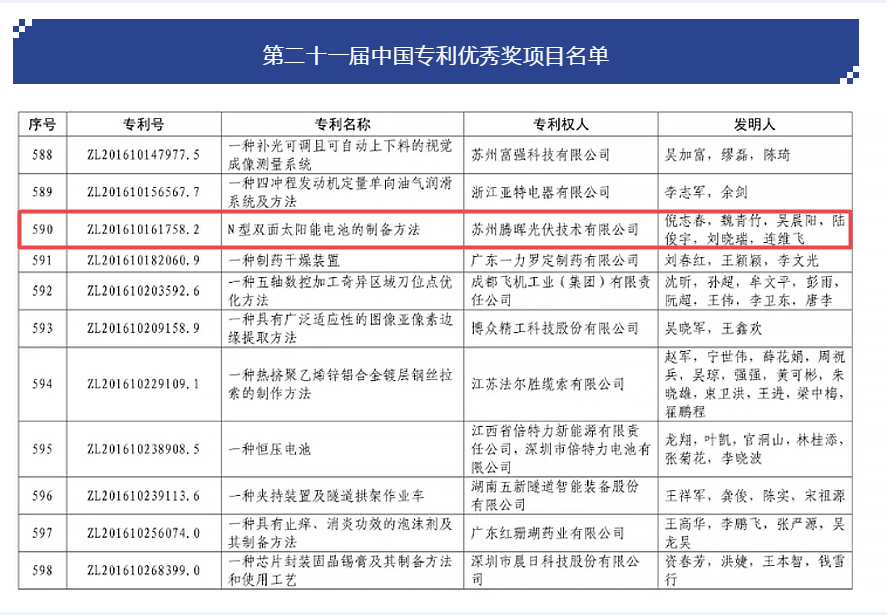 近日,國家知識(shí)產(chǎn)權(quán)局發(fā)布了第二十一屆中國專利獎(jiǎng)?lì)A(yù)獲獎(jiǎng)項(xiàng)名單,蘇州騰暉光伏技術(shù)有限公司的“N型雙面太陽能電池的制備方法”(ZL201610161758.2)專利榮獲中國專利獎(jiǎng)優(yōu)秀獎(jiǎng)。