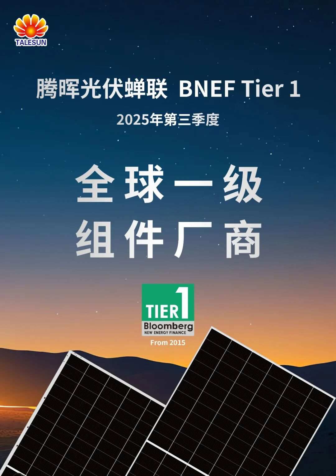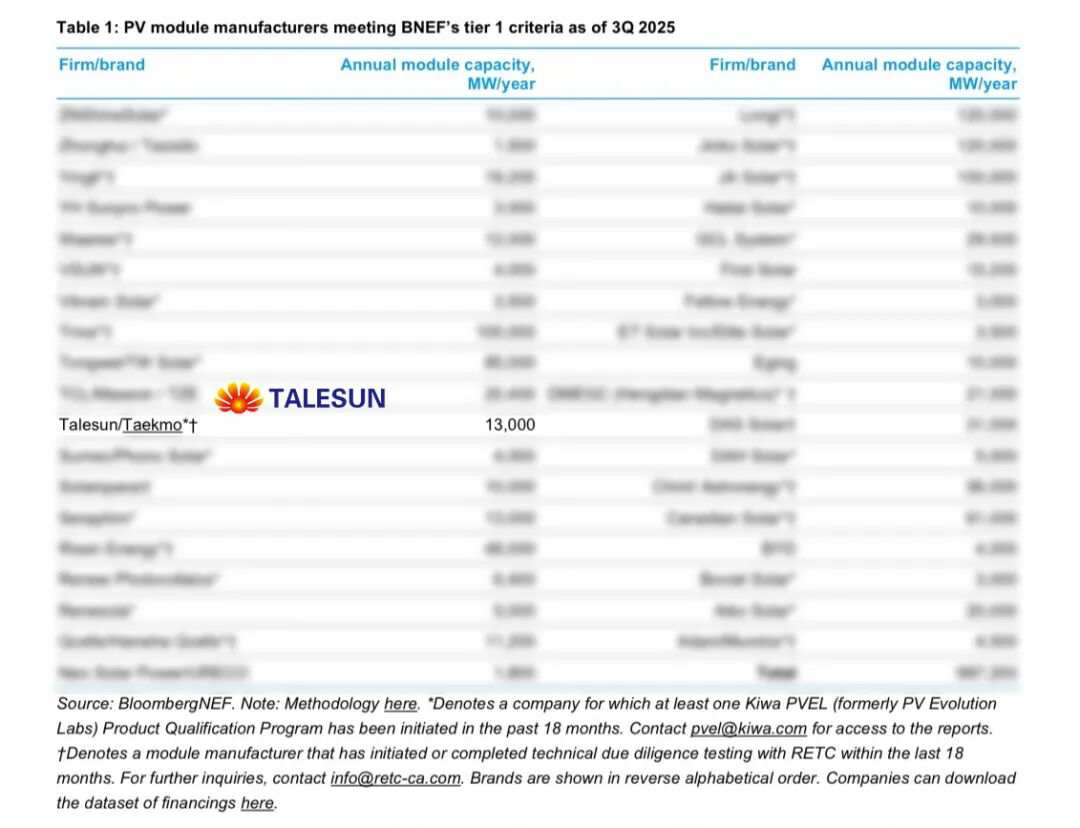 近日,全球知名能源研究機構(gòu)彭博新能源財經(jīng)(BloombergNEF)公布了2025年第三季度光伏組件制造商評級榜單。騰暉光伏憑借卓越的產(chǎn)品品質(zhì)、穩(wěn)健的財務(wù)表現(xiàn)和強大的全球市場競爭力,蟬聯(lián)2025年第三季度Tier 1組件制造商榜單。
