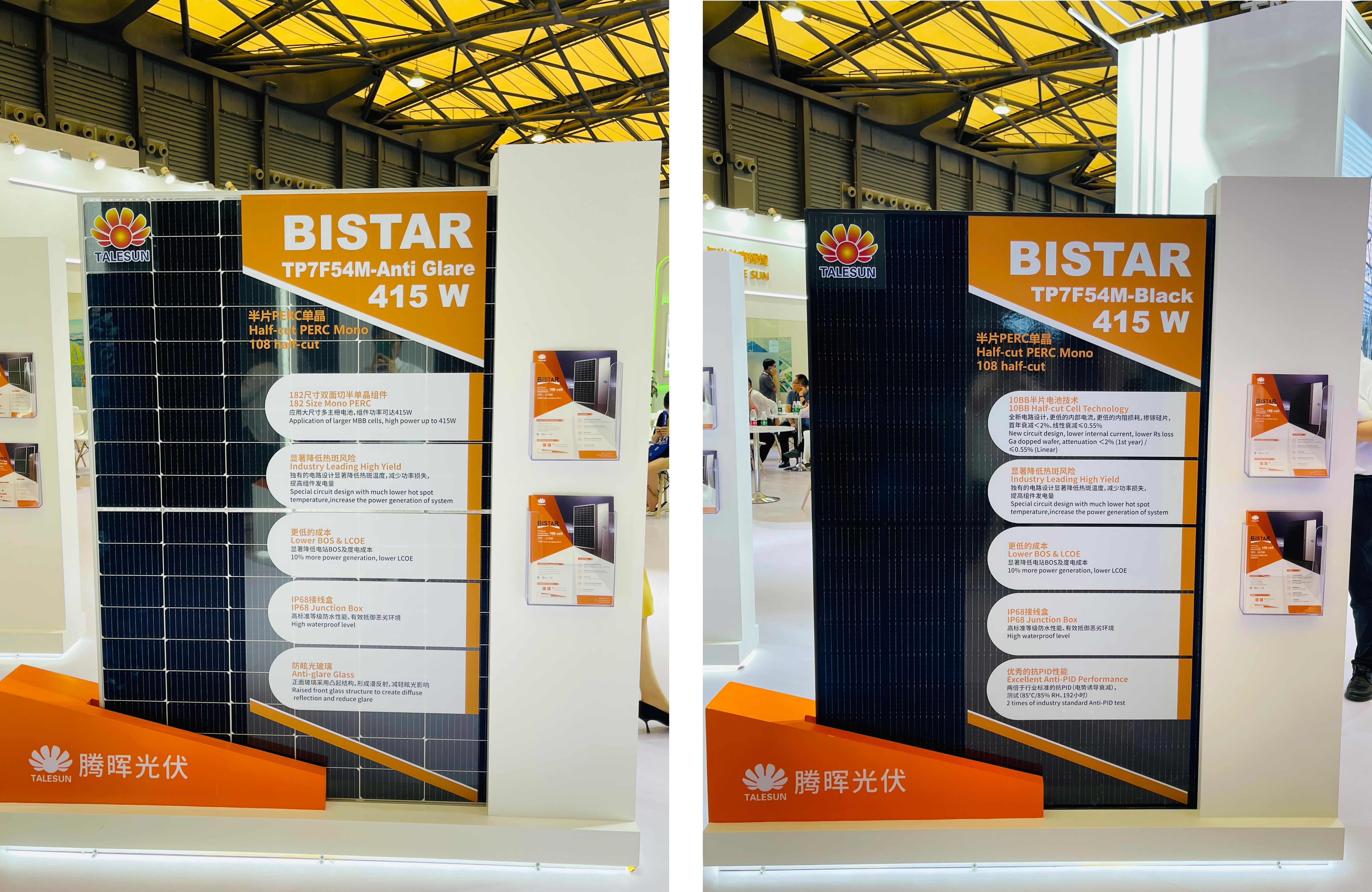 位于 E1-530 展臺(tái)的騰暉光伏,首次攜 N 型組件在國(guó)內(nèi)亮相,正式宣布進(jìn)入“N”時(shí)代。此次展出兩款組件分別為:BIPRO_TM7G72M 及 BIPRO_TM7G54M。由于 N 型組件更低的溫度系數(shù)、更高的雙面率、更低光致衰減等方面的發(fā)電性能優(yōu)勢(shì),比起常規(guī) P 型組件來說在相同直流側(cè)容量下帶來至少 3%的發(fā)電量增益。同時(shí),N 型組件由于更高的轉(zhuǎn)換效率,相應(yīng)降低了所吸收光能的熱轉(zhuǎn)換,從而降低了組件的工作溫度。因此,在提升發(fā)電量的同時(shí),發(fā)電回報(bào)更高、應(yīng)用環(huán)境更廣、更受客戶青睞。